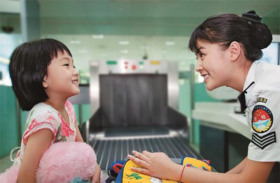 Wu Na talks with a girl at a security station in Shanghai Hongqiao International Airport. [Photo/Shanghai AirportAuthority]