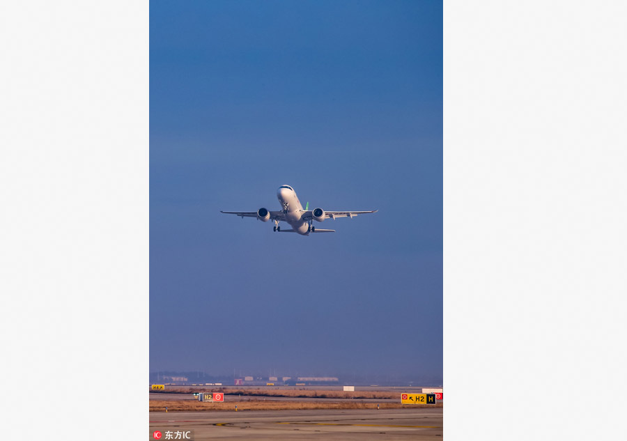 The second C919 aircraft takes off on its first flight of 2018 on Jan 14 in Shanghai. It made its debut flight on Dec 17 in Shanghai. The first C919, China's homegrown narrow-body jet, took off on its launch flight at Pudong International Airport in Shanghai on May 5, 2017.[Photo/IC]