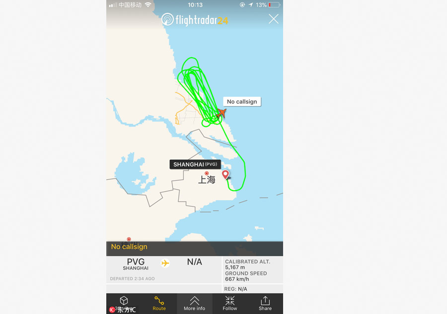 The flight route of the second C919 aircraft on Jan 14, 2018. [Photo/IC]