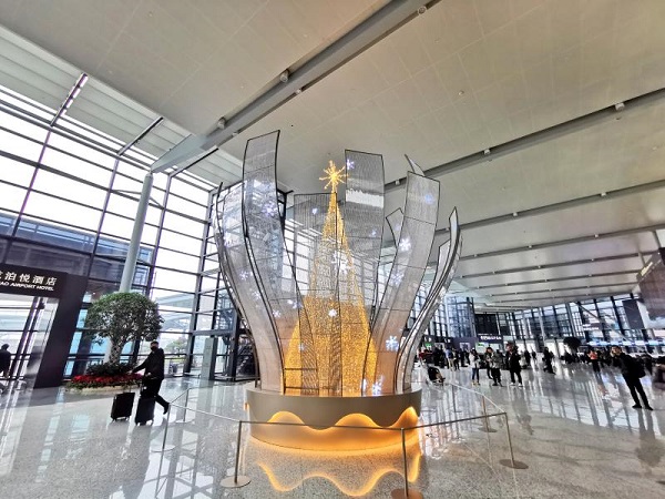 As 2020 approaches, Hongqiao airport's two terminals are decorated with garlands and colored balls to create a festive atmosphere with Shanghai features. The International, Hong Kong-Macao-Taiwan Departures Hall at Hongqiao T1 is decorated with a crystal tree as the main design element, while T2 has white magnolias, the city flower of Shanghai. A seven-meter-high crystal white magnolia tree on the south side of T2's check-in hall attracts many passengers. Using LED soft screen technology to achieve a masterful display of shadow and light with interior decorations and dynamic videos, passengers are enjoying a beautiful visual experience.