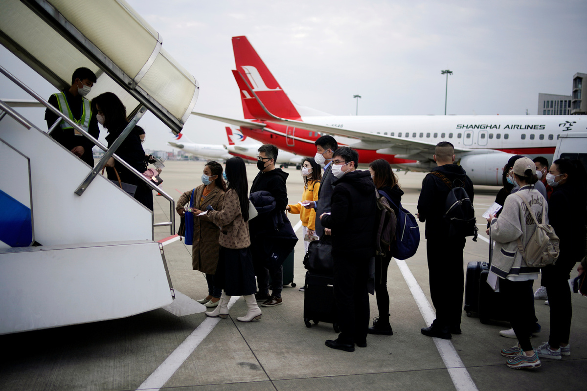 Passengers wearing face masks to prevent the spread of COVID-19 prepare to board an aircraft at Shanghai Hongqiao International Airport in Shanghai, China March 25, 2020. [Photo/Agencies]