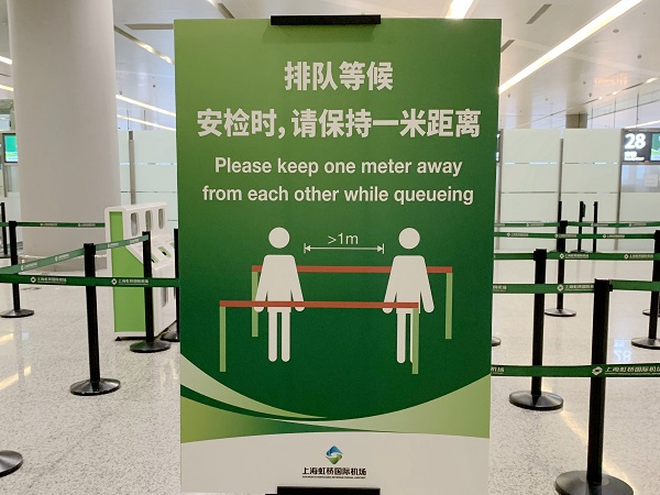 The bilingual safety reminders in Hongqiao airport's waiting area is to remind passengers to avoid gathering and honor social distancing guidelines, remaining at least one meter from other people. [Photo/ Shanghai Airport Authority]