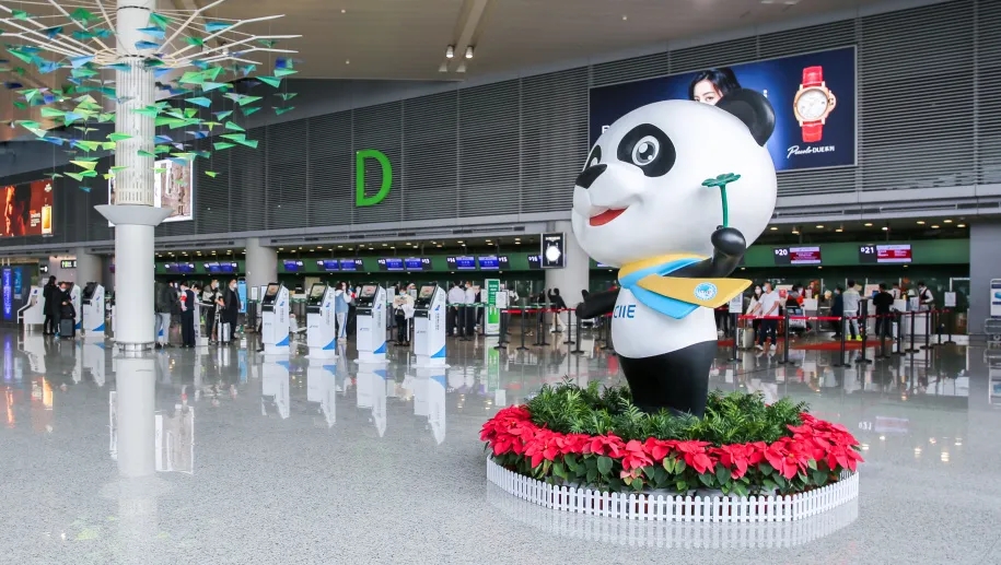 The Pudong and Hongqiao international airports both erected statues of the CIIE mascot Jinbao at their departure and arrival areas, and each airport installed nearly 60 large and medium-sized CIIE-themed green landscapes and fresh flowers.
