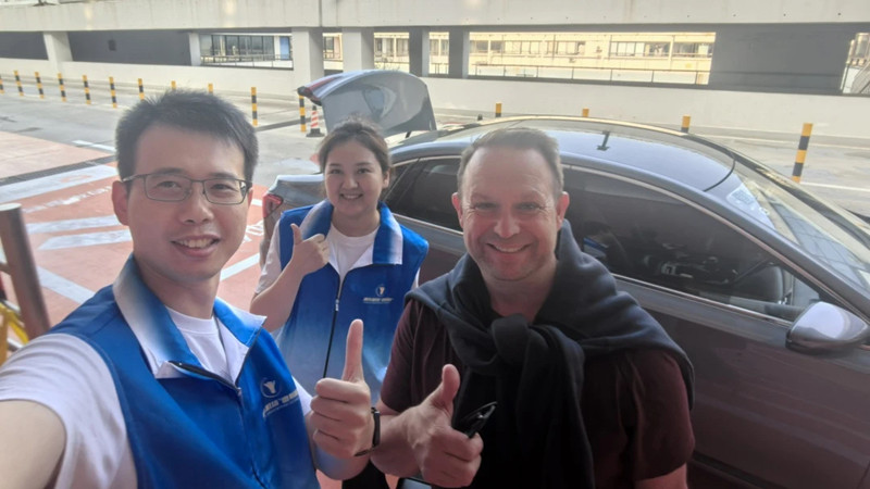 An Australian traveler who needed to book a ride was helped to download and set up a car-hailing app, link a payment method, and was escorted to the pick-up point. He thanked the volunteers with a thumbs-up in gratitude.