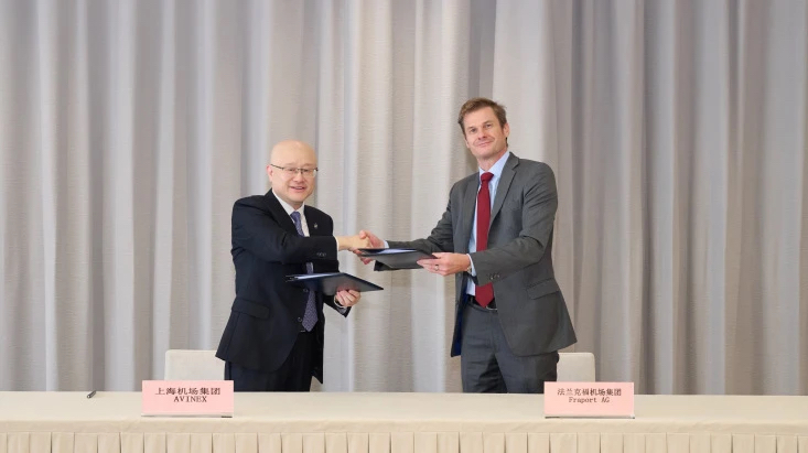 Shanghai Airport Authority (AVINEX) and Fraport Group have signed a memorandum of understanding (MoU) to strengthen their collaboration. AVINEX Vice-President Lyu Yaodong and Alexander Laukenmann, Senior Executive Vice-President of Aviation at Fraport AG, signed on behalf of their organizations, with key department heads present.