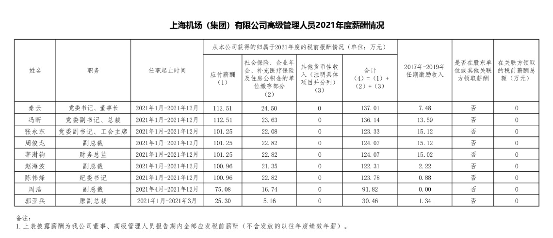 上海机场(集团)有限公司高级管理人员2021年度薪酬情况