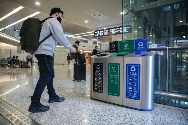 针对机场南来北往旅客较多,生活行为习惯不同,加之疫情常态化防控态势,虹桥机场在深入调研旅客投放垃圾习惯基础上,年内对公共区域近100个垃圾桶全面升级。针对旅客反映垃圾桶侧部开口扁平、小投口容易洒落等问题,新垃圾桶改为顶部大投口,并在桶身及顶部设置了分色分类可视化引导标识,进一步提高旅客投放正确率。针对疫情特点,除了上海市“规定动作”公共区域垃圾分类之外,机场还增加了废弃口罩分类垃圾桶等“自选动作”,方便旅客精准投放。