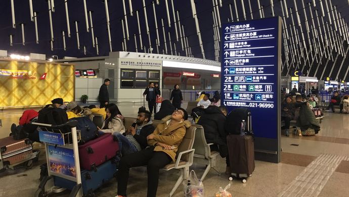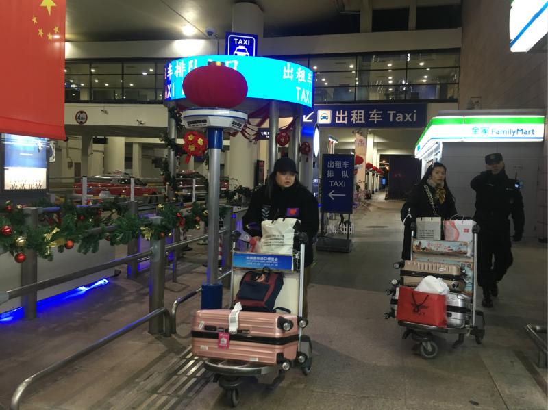 乘坐MU7823航班(西安-浦东机场)的沈姓姐妹从出租车站点折返去乘坐守航夜宵线。(李晔 摄)