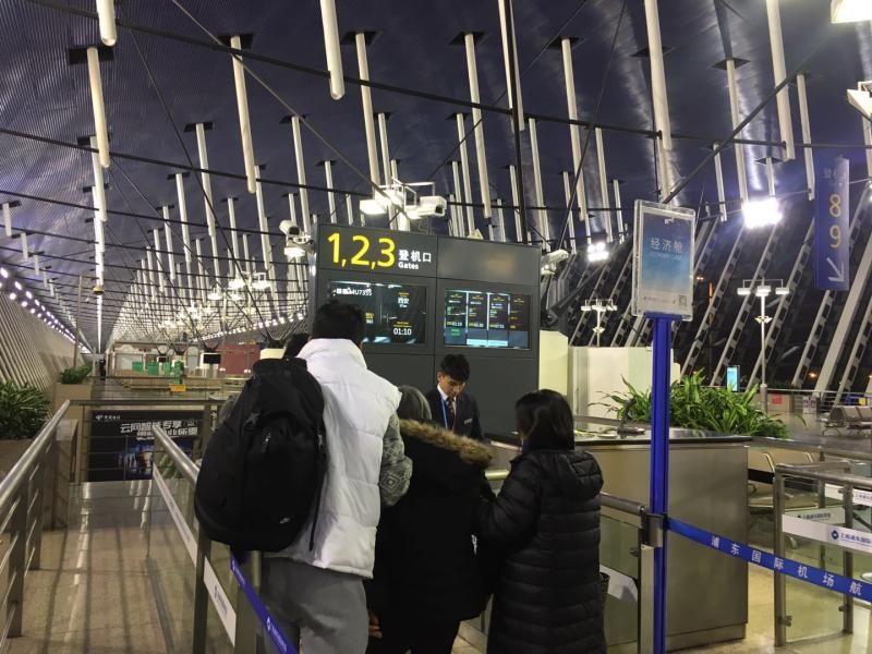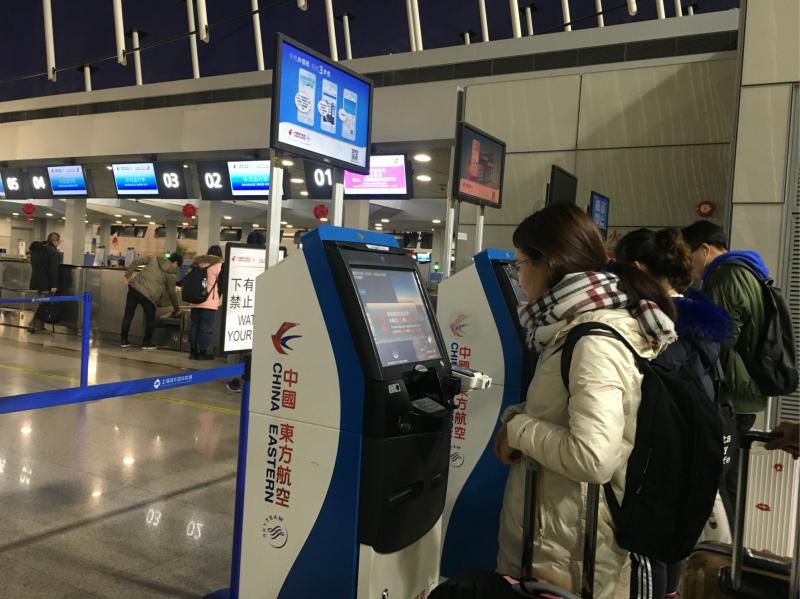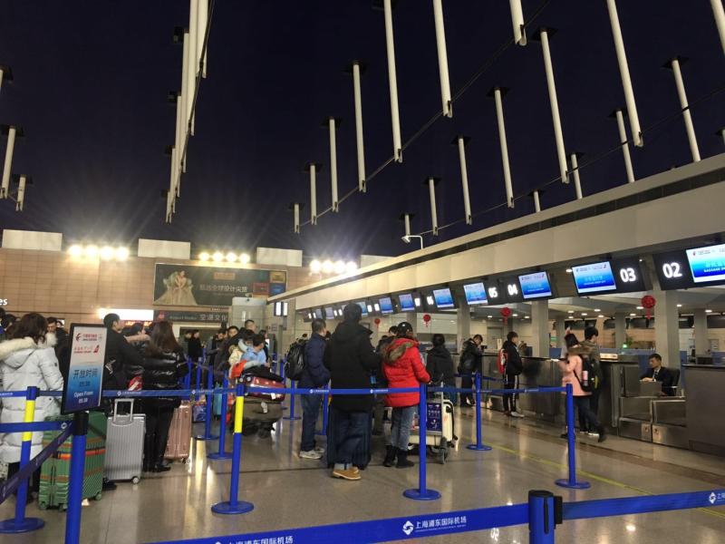 1月30日0时,浦东机场T1出发大厅C岛东航办票柜台前,MU7355航班(浦东机场-西安)正在办理值机手续。