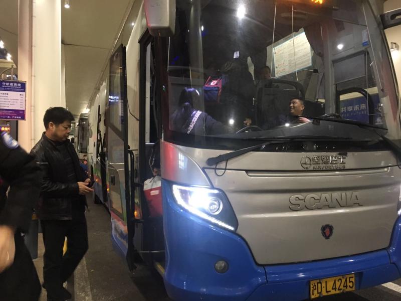 接近凌晨3时,夜间航班抵达的乘客坐上了守航夜宵线。(李晔 摄)
