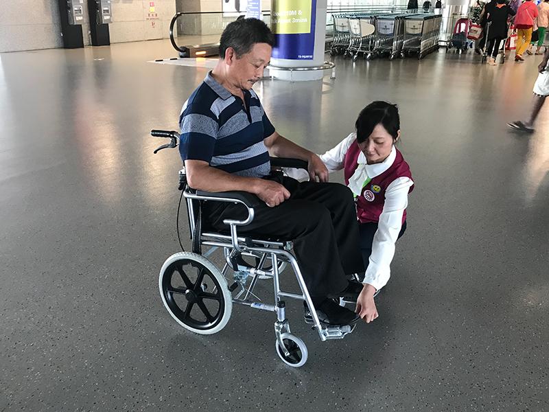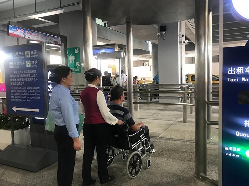 今天,浦东机场将乘坐KA804航班从香港飞来上海的王先生,从抵达登机口接机,并一路护送至出租车站点,由此完成了浦东机场“爱心通道”一站式服务正式从离港旅客拓展至进港旅客后的首单服务。(浦东机场 供图)