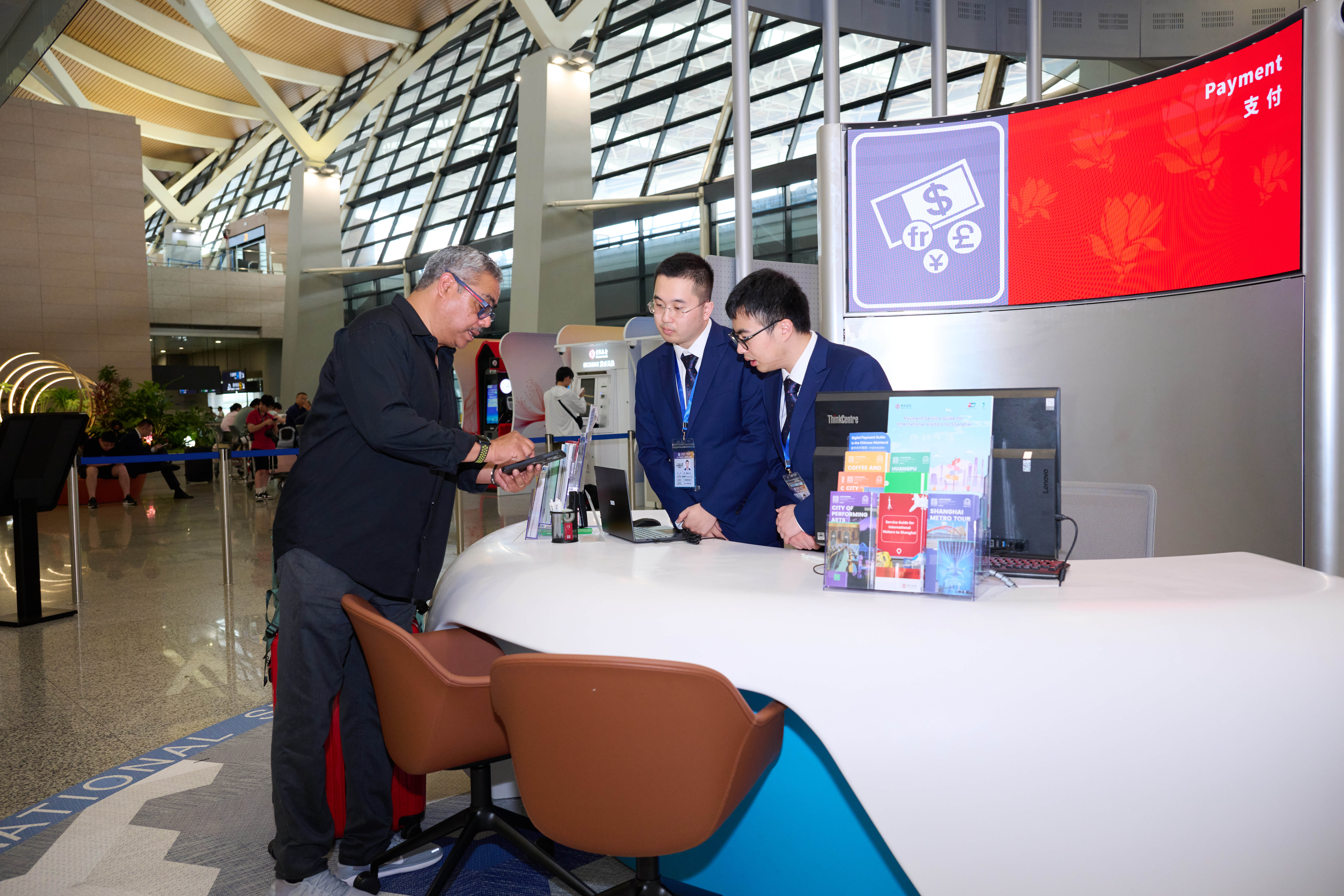 支付服务窗口配备ATM和外币兑换机等自助设备,可支持5种主流国际银行卡取款和20种外币现钞兑换自助服务,同时为抵沪的境外来宾第一时间提供支付服务咨询、移动支付协助下载以及人工窗口外币兑换引导等多元服务。
