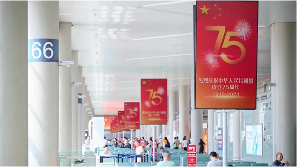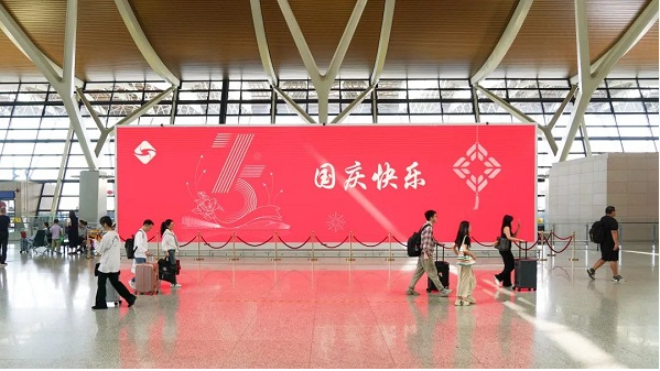 两场在航站楼出发、到达等主要旅客动线上的问询柜台、值机柜台、安检通道、进场高架路等点位布置了两千余面五星红旗和两千余盏中国灯笼,楼内电子屏、广告屏滚动播放庆祝国庆海报。浦东机场以“中国心、梦飞扬”为主题设置了6个主题打卡点和33处氛围景观,虹桥机场设置了9处可以步入式的国庆主题花园景观,给旅客提供近距离观赏体验。机场问询柜台和出租车站点还免费赠送小国旗、主题钥匙扣、徽章等小礼物,与旅客和驾驶员们共庆祖国华诞。