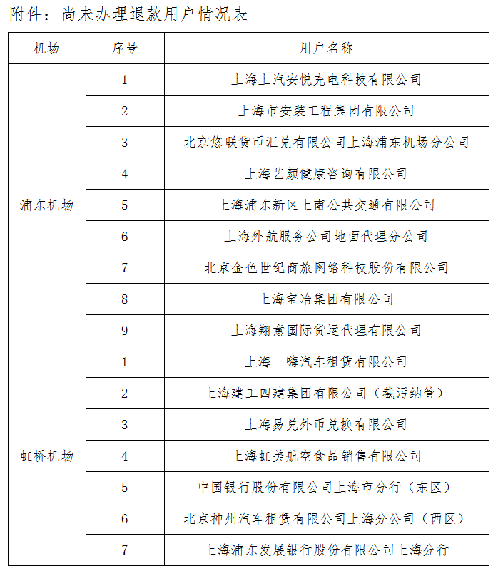 经研究决定,我司将退还浦东机场及虹桥机场供电区域内转供电用户2019年6月至2019年11月期间收取的能源管理费(电)。大部分驻场单位已完成退费办理手续,但仍有部分用户由于无法联络或电话联络后未前来办理等原因,我司未能完成全部退款工作。