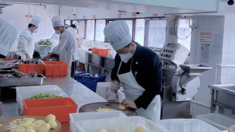 浦东机场候机楼餐饮公司每天承担着39000份左右的供餐任务,在保障量显著增加、防疫要求逐步提高的情况下,258名餐饮人日夜坚守在职工餐食保供的最前线。食堂管理部经理李厚财和他的团队在最为艰苦的条件下,竭尽所能丰富职工的三时三餐,在浦东封控的前一夜,他拨通了近100个电话,与供货方充分协调接洽,全力确保了员工餐食保障不断不乱。李厚财说:“最令我感动的就是我们餐饮公司这支员工队伍,没有人喊苦喊累,每天起早贪黑,就只有一个目标,那就是给员工提供安心暖心的饭菜,让坚守岗位的员工能从食物中感受到慰藉。”当切配环节人手不够的时候,李厚财带领驻场机关员工加入到切配队伍,无论是抡起大刀砍大骨、挽起袖子削土豆还是抄起大勺打饭菜,在他的带领下不少员工都成为了多面手,切配、打包、理菜样样能干。