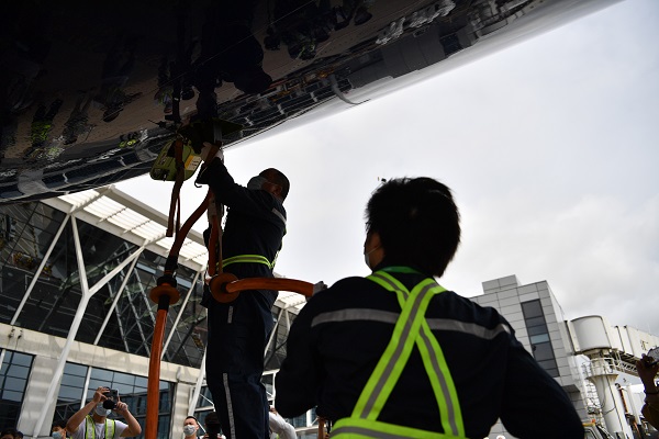 浦东机场桥载设备操作员张磊为了保证进出港航班能够正常使用400HZ电源、飞机专用空调设备,必须提前到达桥位,从设备面板检查、提前摆放接机设备,设备接入操作、现场设备监护、收空调管收电缆设备........整个流程要头顶烈日,承受着飞机发动机余热和尾气的熏烤,至少需要在烈日下持续工作1个小时以上。烈日下,入境航班的桥载操作员必须带着口罩身背20多斤的电缆设备进行接撤电操作,每人每天多达20次以上,工作强度极高。入境航班旅客需要配合海关在机舱内先进行登临检疫,需要分批下飞机,因此飞机靠桥后旅客在机舱停留更长时间,高温天机舱内开足空调是必须的,桥载操作员保障入境航班的时间也比一般航班要更长,也更辛苦。飞机停靠后使用桥载设备代替APU,为飞机提供电源和空调,可以大大降低航空公司运行成本,减少机坪噪音和空气污染,是落实蓝天保卫战、全力打造绿色机场的主要举措。