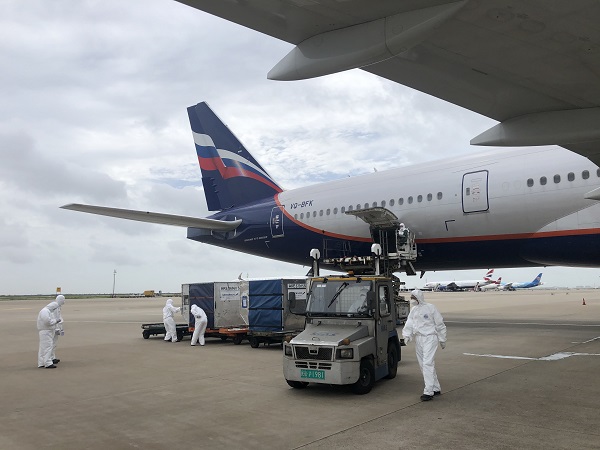 夏季机坪地表温度暴晒后高达60度,装卸人员要顶着烈日在机坪上进行高强度作业。因为疫情防控,入境航班保障时需要身穿防护服,佩戴N95口罩和手套,戴上就是几个小时。入境航班货物的装卸在海关实施消毒之前,因此工作人员在装卸时必须加强自身防护,体感更加闷热。每次航班操作保障结束,马海强和同事们全身浸泡在汗水中,全身衣物没有一件是干的。规范装卸关乎到飞行安全,客机操作时,装卸人员要在规范操作保障安全的前提下注重效率,关注首末件行李的操作时间;货机操作过程中会遇到各类特殊保障流程,如开机头操作、中央装载、超规货板装载等。今年3月份以来,装卸迎来了一项新任务:“客舱载货”航班保障,货物被拆成“体积小、数量多”的散货,每个航班约有拆成一千多件的小件货物一件件人工装入客舱,部分航空公司甚至需要客舱内协助摆放固定,操作难度大、风险高,从机下拆板人员、客梯车上递货人员到舱门口接货人员都要密切配合,协同操作。装卸人员克服各类保障困难,到7月中旬,已累计保障“客改货”航班800余架次。