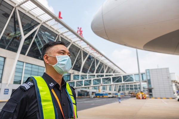 负责这架入境航班监护的兰军军,额头上的汗浸湿了口罩,但高温和闷热不会影响他的聚焦点。当对入境航班实施监护执勤时,他会更加严密地监控着飞机周边的情况,严防无关人员、车辆靠近该飞机。机坪区域是监护工作的主战场,浦东机场机坪围界约50公里,326个停机位,监护岗位具有点多、线长、面广的特点,在盛夏的机坪上,步巡队员要在高达60多度的地面上每天行走5万步以上。暑运期间,飞机监护科平均每天监护出港航班500余架次(含货机90架次左右),远机位航班没有任何遮挡,且需要全程站立执勤,飞机监护员皮肤被晒的黝黑,汗水湿透衣衫是家常便饭。