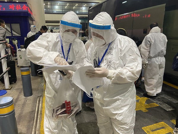 吴辉华是浦东机场交通保障部T2转运组组员,负责浦东机场T2航站楼入境旅客的引导、协助录入信息及核对、移交至隔离转运车辆站点等工作。T2转运组自3月6日成立以来,便开始负责浦东机场T2航站楼入境旅客的隔离转运工作。转运组人员首先要严格按照标准做好自身防护,在炎热高温的三伏天,他们同样要身着密不透风的防护服来回走动,完成4个环节的工作:在2A国际到达出口处,根据入境旅客的目的地进行分流引导至不同的转运区域;协助入境旅客扫码填写相关信息,包括姓名、护照号、入境航班、14天内路径等信息;收取旅客护照,引导旅客至转运登记点扫码登记录入旅客信息;核对旅客登记信息,确认完毕后将护照、信息表以及旅客移交给29号门外特保,待交接完毕后,返回原岗位。完成一个工作流程身穿防护服的他们就会满身大汗,浸透衣衫。随着入境航班的不断增加,如今T2转运组平均每天要转运1000多名入境旅客至隔离点进行集中隔离。