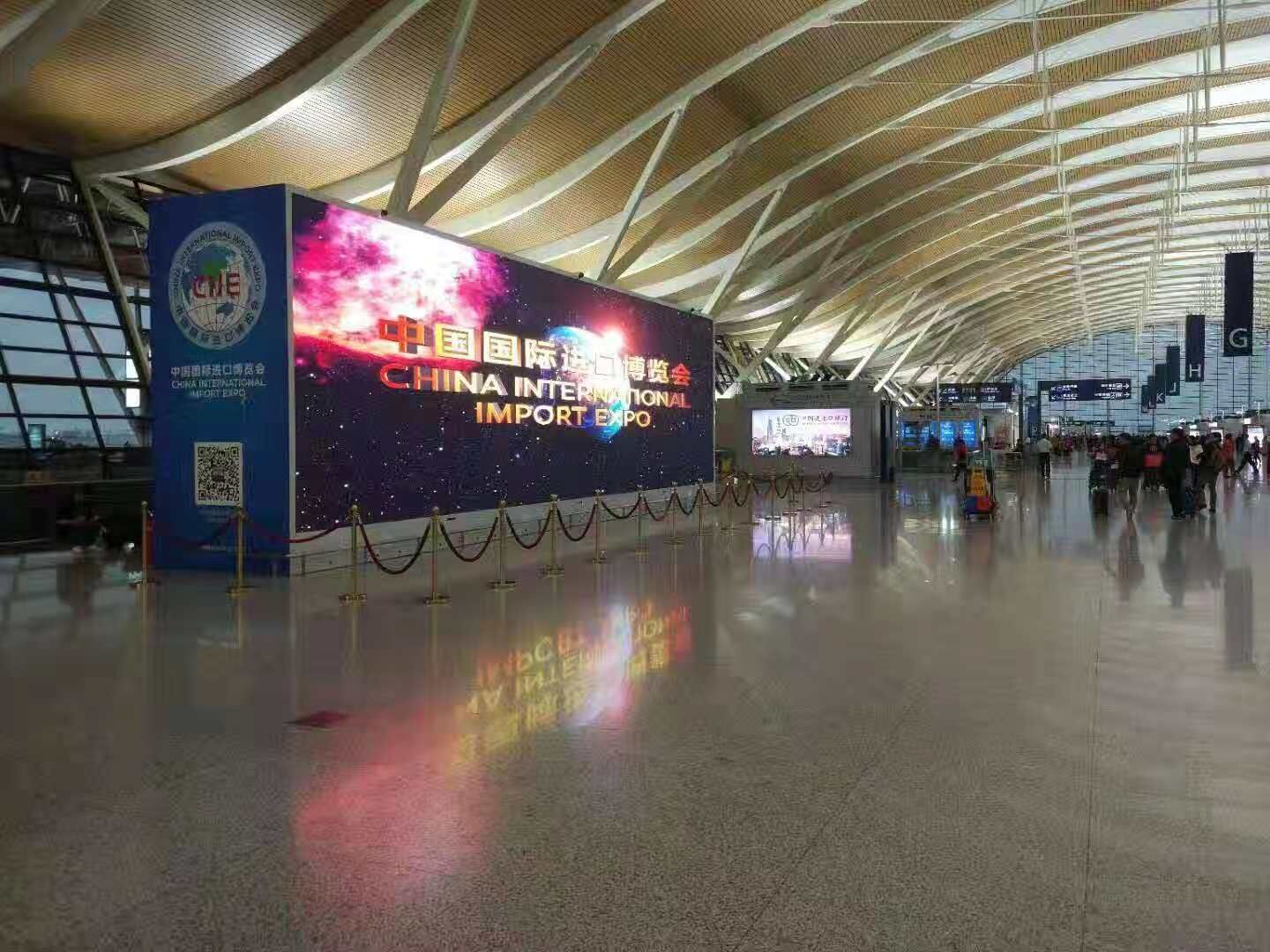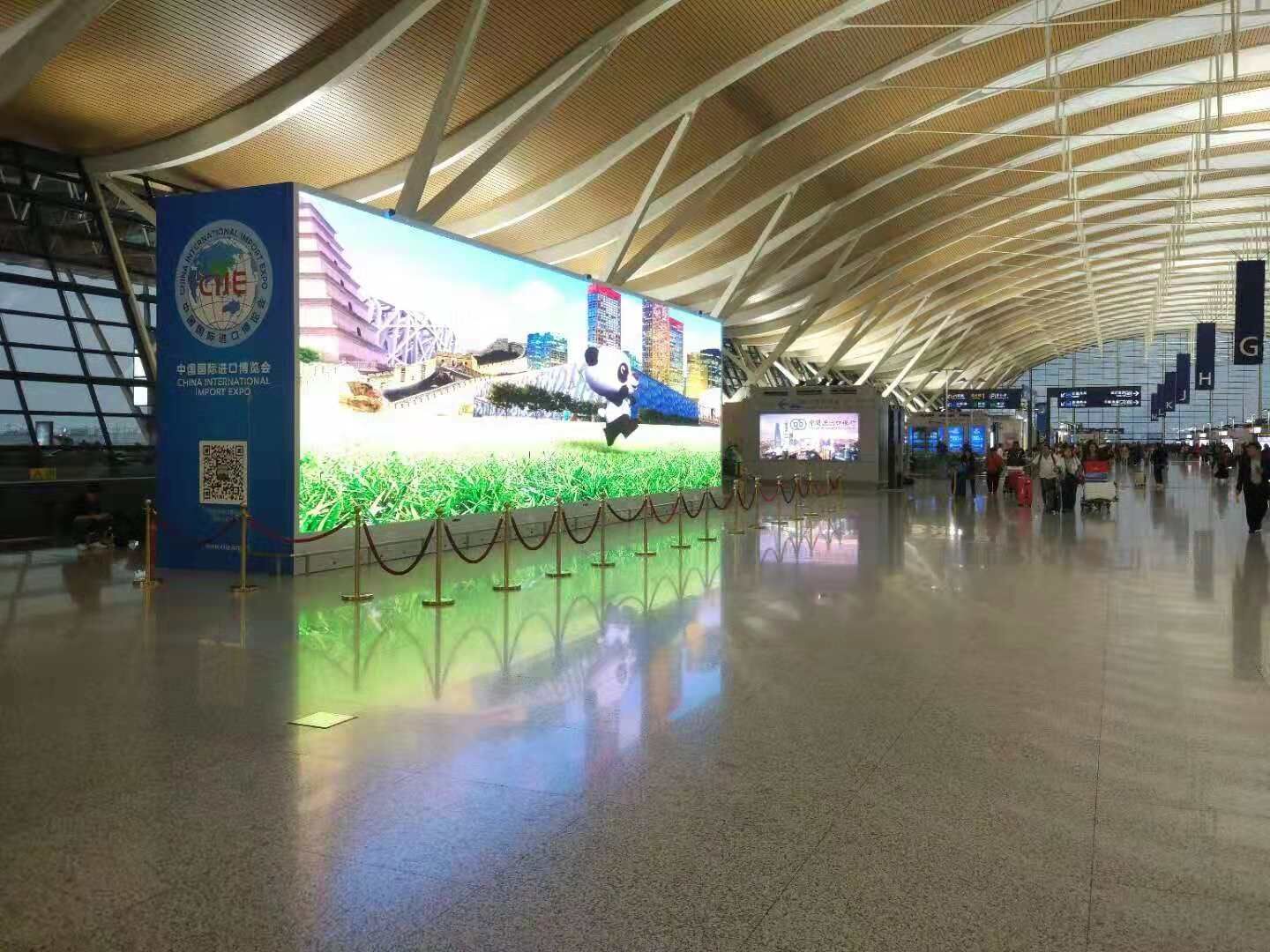 10月23日,浦东机场为进博会精心打造的一座高4.5米、长15米的LED宣传屏在2号航站楼出发区域落成。
