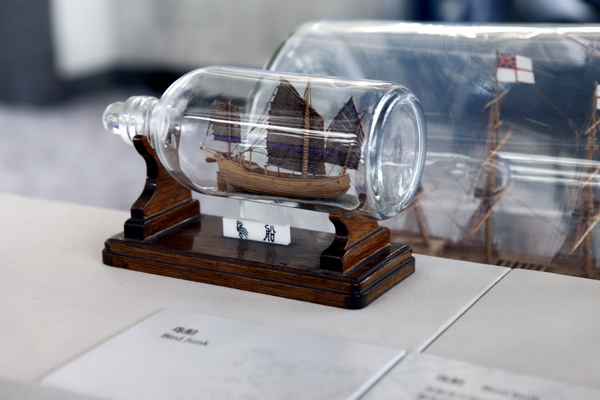 瓶中船,顾名思义是在瓶子里制作的微型船模,起源自欧洲的远航水手间。瓶中船的雏形大多选材自鲸鱼和海象等海生动物的骨骼和牙齿,结合船上的空调料瓶,配以少量绳子和丝线,在水手们手里就变成了精美的艺术品。瓶中船和其他航海工艺品一样,一开始只是水手们为了打发船上的闲暇时光,对抗长年累月的孤独而练就的手艺。渐渐地,水手们赋予了瓶中船更多的情感寄托,创作题材越来越丰富,形成了独特的航海艺术品门类。当船舶结束远航停泊靠岸时,他们带着自己的心爱之作回家,向亲朋好友展示瓶中船,讲述航行过程发生的种种。经过两次世界大战后,早期的瓶中船所剩无几。所幸的是,随着船舶驾驶技术的进步,水手们有了更多的闲暇时间,瓶中船制作技艺又重新得以发展,并在普通人群中聚集了大量爱好者。上海中国航海博物馆共收藏了四十余件瓶中船,它们无一不是航海工艺品的典型代表。
